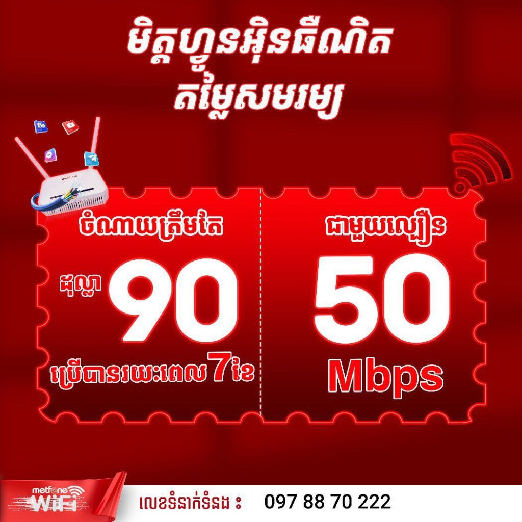Metfone internet Wifi Home Package $15 … 50Mbps … 3 months 6 months 12 months … Installation fee: $10 … Free deposit … 1 modem provided on loan … Valid for 3 months … Promotion Sim … Free 2 Sim.