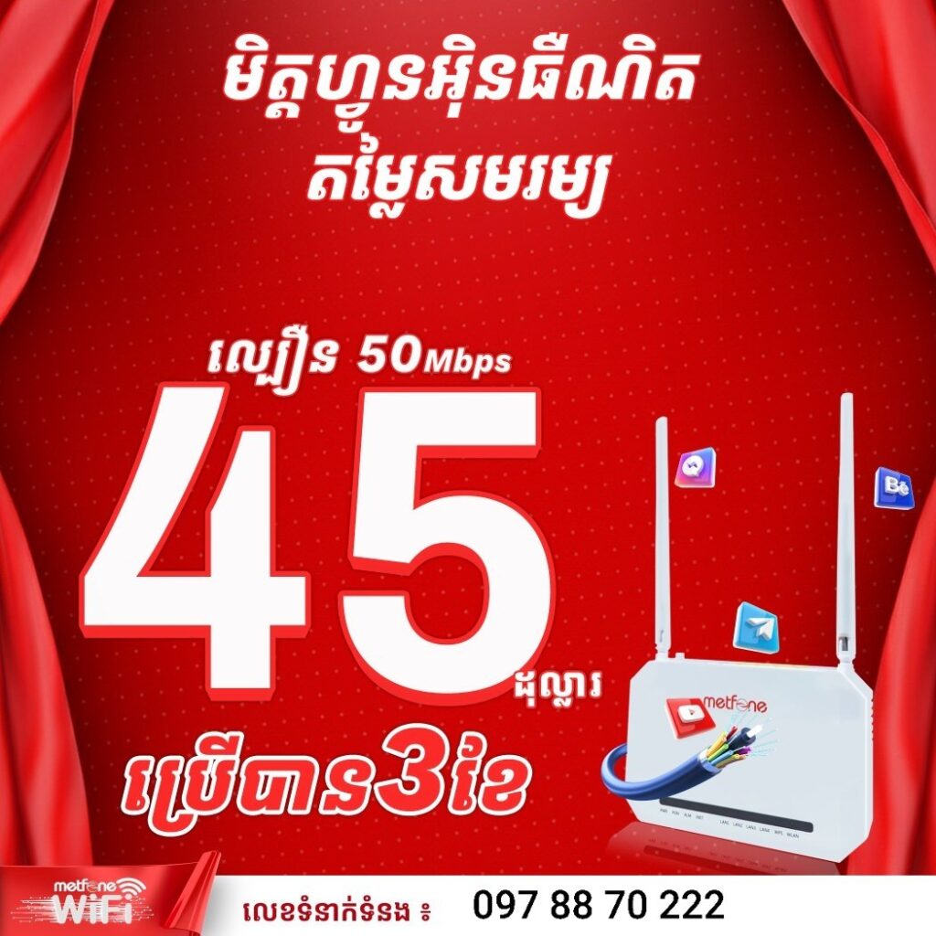 Metfone Internet WiFi the best service provider in cambodia Home Internet 50Mbps 15$/month payment 45$ can use internet 3month payment 90$ can use internet 7month payment 180$ can use internet 15month.