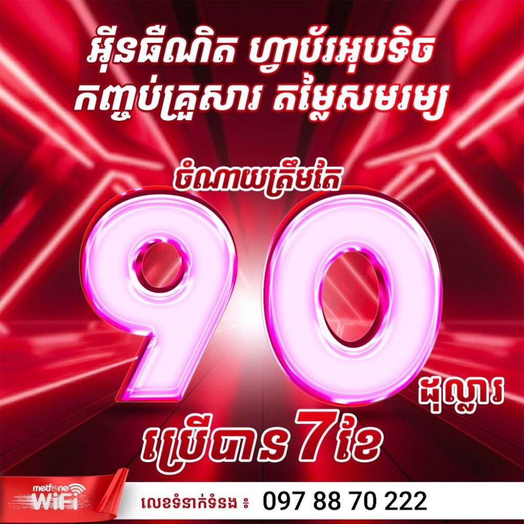 Metfone Internet Service Provider The best service in cambodia Internet for Home 50Mbps 15$/month payment 45$ can use internet 3month payment 90$ can use internet 7month payment 180$ can sue internet 15month.