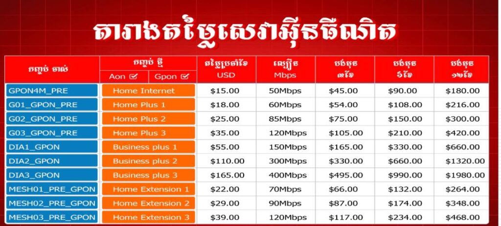 ✓Metfone Wi-Fi Internet Plans: ᯤ $15/month (50Mbps) ᯤ $18/month (60Mbps) ᯤ $25/month (85Mbps) ᯤ $35/month (120Mbps). Special Benefits for New Customers …3rd Prize: Free optic FTTH for 2 months (30 prizes)