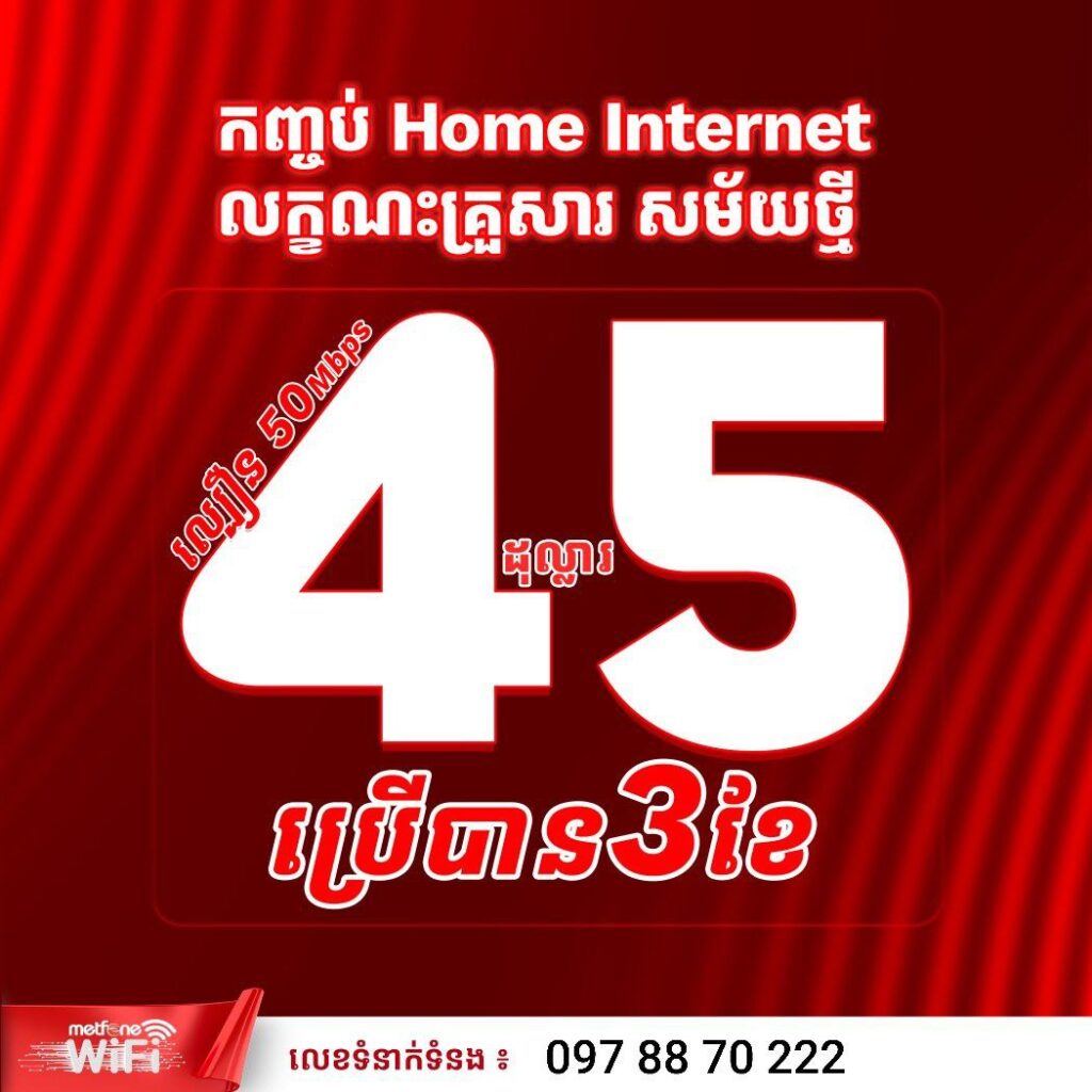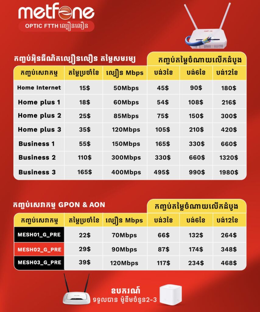 Metfone Internet Wifi $15 … 50Mbps Payment 45$ 3months Payment 90$ 6months Payment 180$ 12months … Installation fee: $10 … Free deposit … 1 modem provided on loan … Valid for 3 months … Promotion Sim … Free 2 Sim.