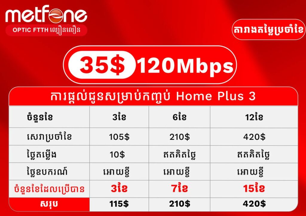 Metfone home Wi-Fi internet plans start at $15/month for 50Mbps, with higher speeds and corresponding prices such as $18/month for 60Mbps and $35/month for 120Mbps, and they also offer discounts for longer advance payments and bonuses for new customers.